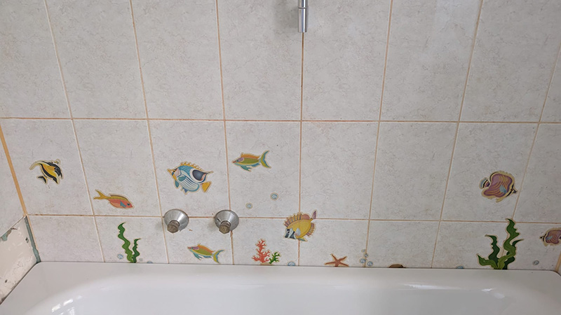 Alter Zustand, unsaubere Fugen, alte Wandmotive und Bohrlöcher in den Fliesen